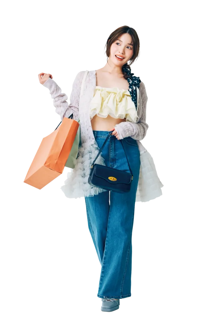 ニットトップス(ビスチエつきニットトップス)は着回し。チュールぺプラムカーディガン 24,200円/HONEY MI HONEY フレアーデニムパンツ 13,970円/RANDA ネックレス 2,640円/Lupine*(soja showroom)バッグ 6,490円/カシュカシュ(アンビリオン)シューズ 9,900円/EVOL