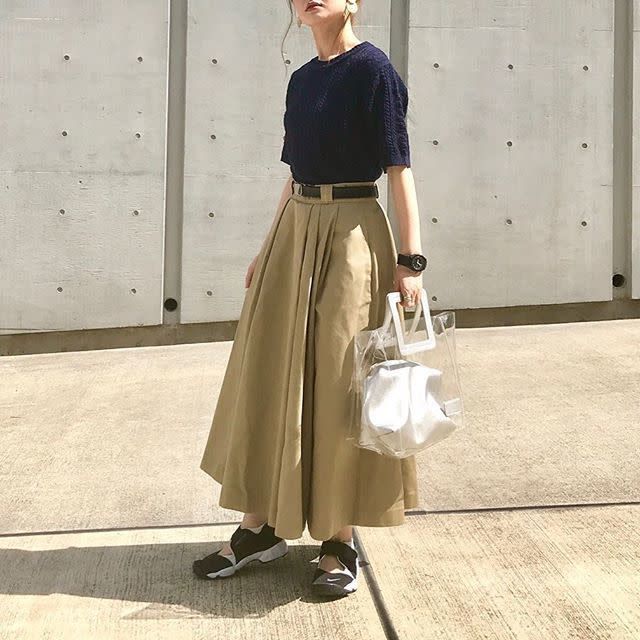 こちらは、ふんわりフレアスカートにホワイトのクリアバッグを合わせた2018年らしいスタイリング。特徴的な持ち手デザインは、この頃から多く見られるようになりました。さまざまなブランドから登場していたので、クローゼットにある方も多いかもしれません。
