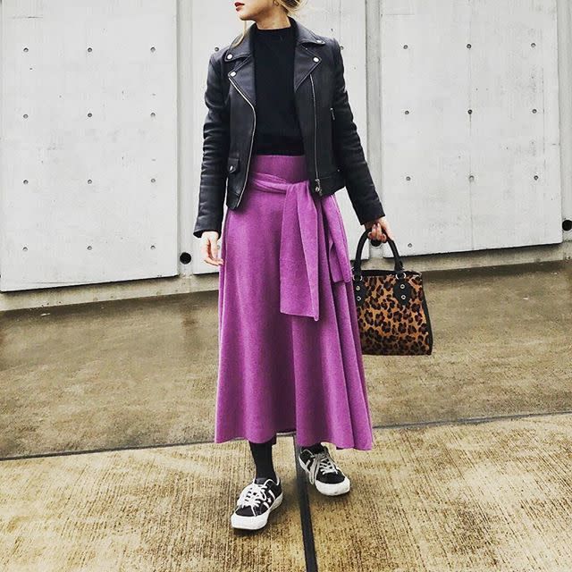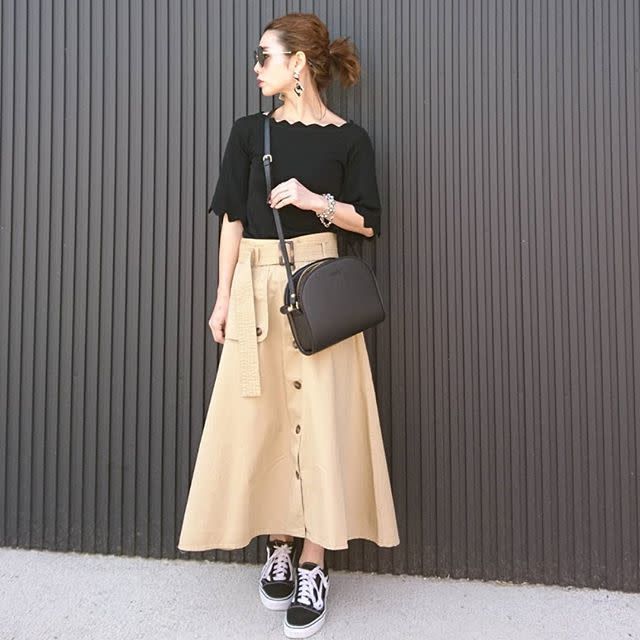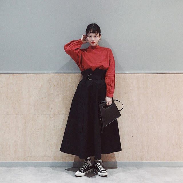 こちらでは、ブラックのトレンチスカートを赤トップスに合わせて。足元はスニーカーで親しみやすくまとめるスタイリングも2018年らしいバランスでした。2015年頃から流行ったミモレ丈やロング丈が定着し、長めのスカート丈が多く見られたのも2018年ファッションの特徴です。
