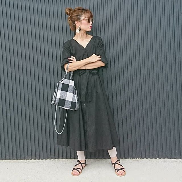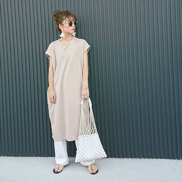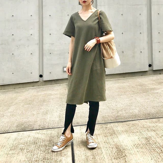 レギンスは定番の黒以外に、アイボリーやグレーなどのカラーも人気でした。スナップでは、黒ワンピースにアイボリーのレギンスパンツを重ねておしゃれにスタイリング。