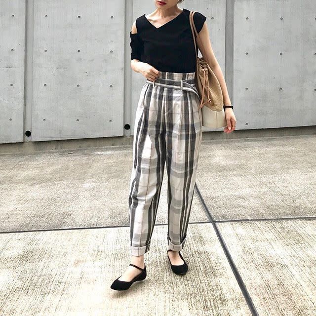 レギンスパンツが新しく登場した2018年ですが、引き続きハイウエストパンツもトレンドでした。トレンチスカートが流行ったことから、似たようなディテールのパンツも展開されていましたよ。例えばスナップは、ベルトをアクセントにしたチェック柄ハイウエストパンツを主役にしたおしゃれコーデ。