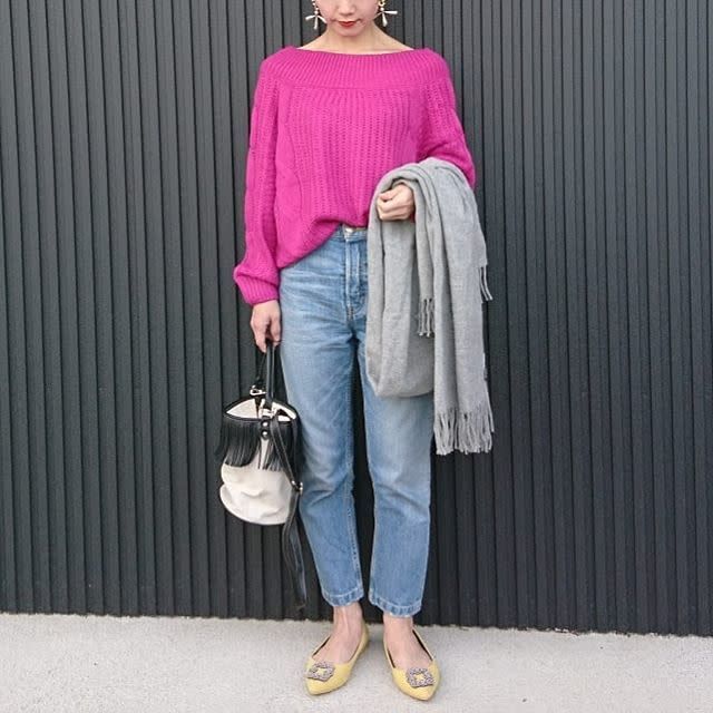 2018年のスタイリングをチェックしていて多かった差し色が「フューシャピンク」です。華やかさの中に大人の落ち着き感も感じる色合いは、当時のファッショントレンドにピッタリ!