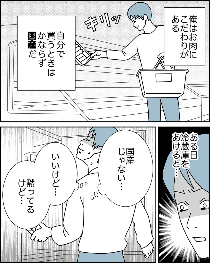 ある日冷蔵庫を開けた瞬間、視界に飛び込んできた外国産の肉に、ショックを隠しきれない夫。「なんで国産じゃないの……」と声も出ないほど落ち込んでしまうのだそう。しかし食事を作ってくれているのであれば文句を言ってはいけないと、わきまえてもいるのです。妻側もこだわりたくてもこだわれないのかもしれません、物価高のせいで。いったん諦めましょう。そしてこれから国産肉のために、夫婦で頑張って稼ぎましょう!