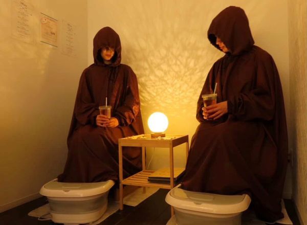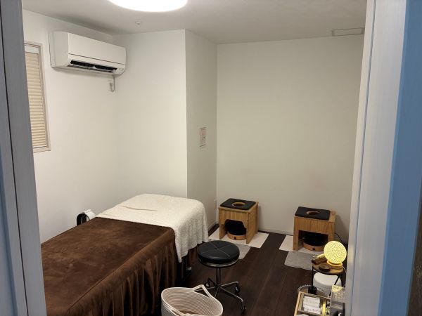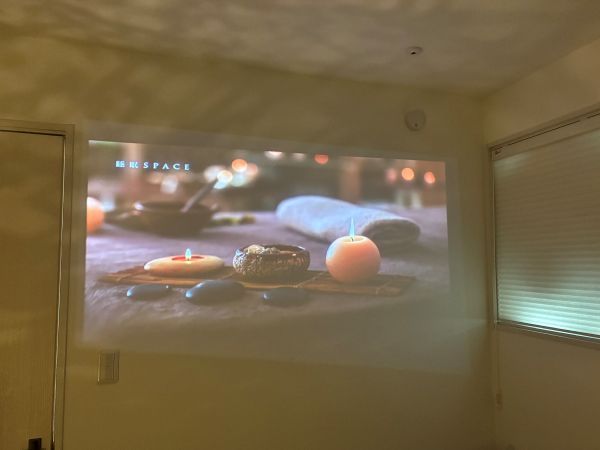 店内は白を基調とした落ち着いた雰囲気で、よもぎ蒸しの間には、スクリーンに映し出されるYouTubeなどを見ながら過ごすこともできます。飽きさせない工夫が施されていて、本当にゆったりとした、癒しの時間を過ごせる空間です。