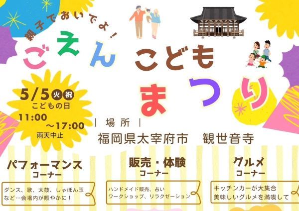 5月5日(子供の日・祝日/火)11:00~17:00に観世音寺で開催される「ごえんこどもまつり」に、『Salon Kalea』が出店予定です。今回の出店では、耳つぼジュエリーの体験ができるそうです。