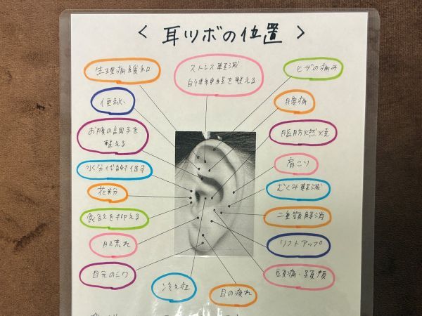 耳のマッサージを行ってから、つぼにジュエリーを貼っていきます。気になる反射区のつぼに貼ってもらったり、マッサージを受けてから、特に刺激を感じた部分に貼っていただいたりと、相談しながら施術が進むので、安心してお任せできます。私の場合、マッサージ中に強く刺激を感じた、自律神経・肩こり・頭痛/頸椎・目の疲れ・胃腸の5ヶ所の反射区に、ジュエリーをつけていただきました!