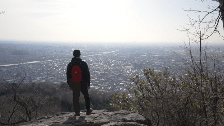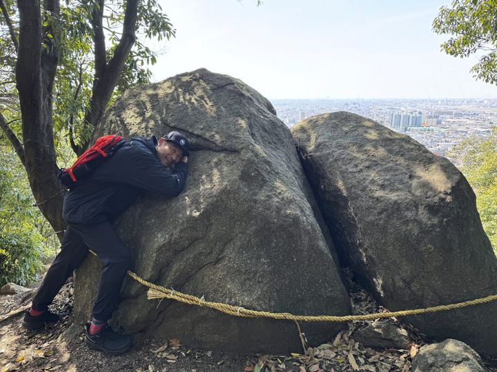 ここまで穏やかな登山が続いた高尾山、最後に現れたのは急斜面をロープ伝いに登る連続した岩場。そしてたどり着いたのが幾多の巨岩で構成された山頂。これでもかというくらい低山の魅力を満載した高尾山の頂から見えたのは…午後の光に包まれた大阪平野を一望する絶景。まさか278mの低山でここまでの景色に出会えるとは予想していなかった平山さん、口からは出た第一声は唸り声!