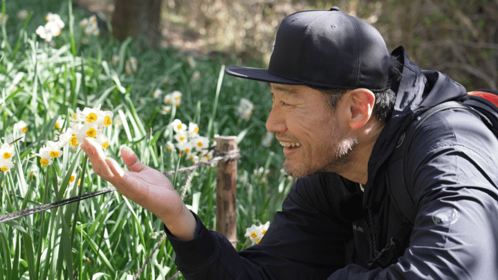 少し下って谷にかかる橋を越えてしばらく行くと「水仙郷」に差しかかる。市民団体によって植栽・管理されている数万株におよぶ水仙の群生が春の訪れを告げてくれる。無骨な役柄を演じることが多いイケオジ俳優の頬も思わず緩んでしまうのだった。