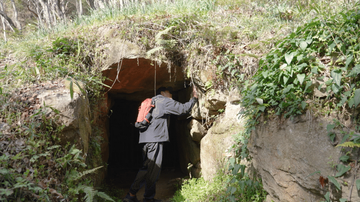 再びゆるやかな登りが始まると道なりにいくつもの古墳が現れる。実は柏原市の東部一帯には日本最大規模の古墳群があり、この高尾山の山腹にも古墳時代中期から後期にかけて造られたとされる円墳の横穴式石室の跡が数多く残されているのである。近畿地方を中心にヤマト王権が各地の豪族を従えていた時代に思いを馳せる平山さんであった。