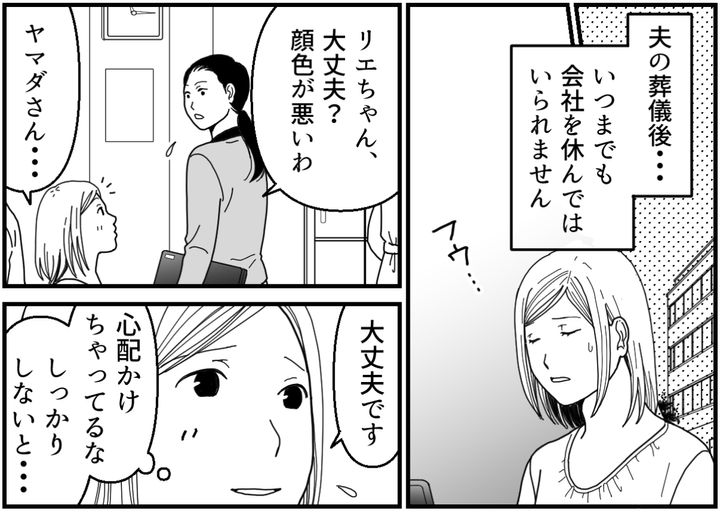 夫の葬儀でも突然の出来事に心がついていきません。「夫がいなくなった」という事実を突き付けられ、私は悲しみのどん底にいました。そんな私の背中をさすってくれたヒナちゃん。大切な人を亡くしてしまったことを分かち合うように、私たちは声を上げて泣きました。泣いて、泣いて、涙がまだ乾かないうちに……。私は身体の変化に気が付いたのです。