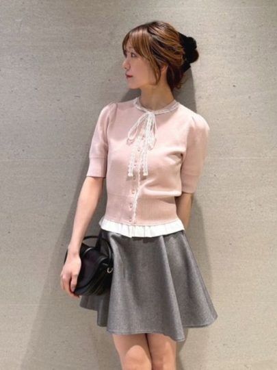 カーディガンできちんと感と可愛さを両立。レースリボンは取り外しが可能なので、気分や場所に合わせて雰囲気を変えられるのがうれしい。