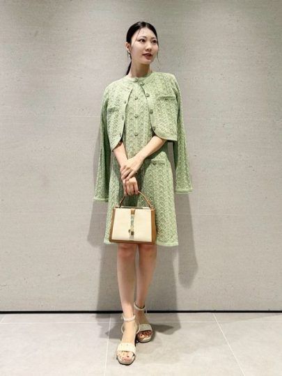 透け感のあるニットワンピに同シリーズのカーデを羽織って、統一感のあるスタイリングが完成。落ち着きのあるグリーンなので、カラー初心者さんにもオススメ。