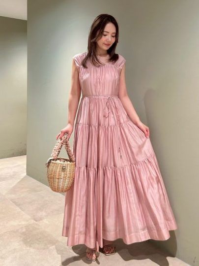 パッと華やぐピンクのワンピースがコーデの主役。動くたびにふわっとエアリーに揺れて軽やかに着こなせます。