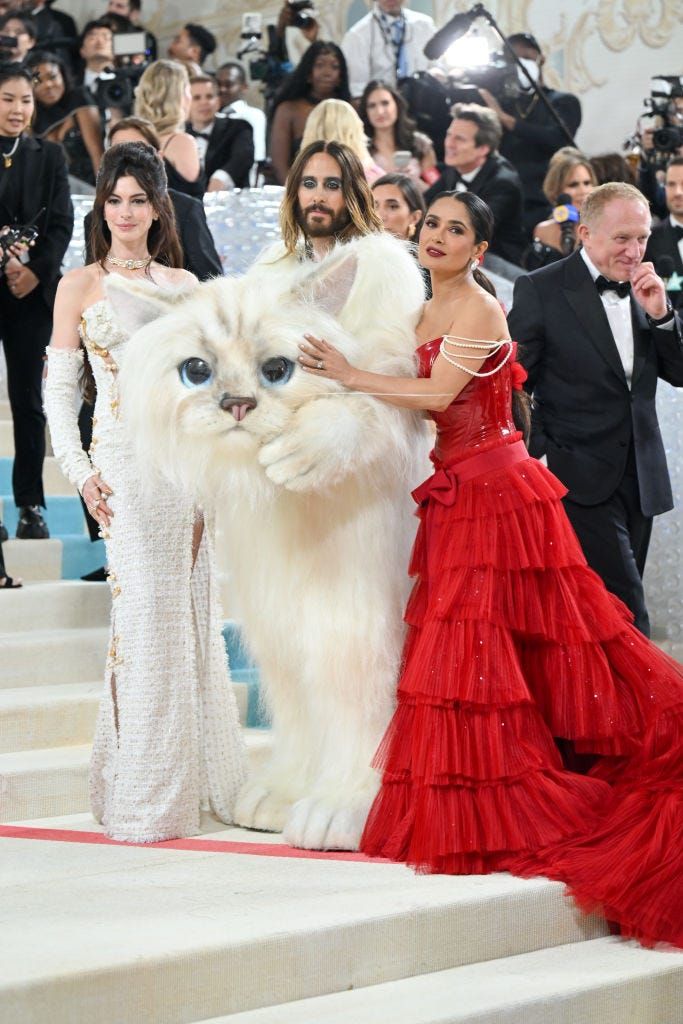 ひときわ目を引いたのは、カールの愛猫シュペットに扮して出席したジャレッド・レト。あまりにもキュートな姿に、アン・ハサウェイ(左)とサルマ・ハエック(右)も駆けつけ、カメラの前でポーズ。アンはヴェルサーチェ、サルマはグッチのドレスを着用している。