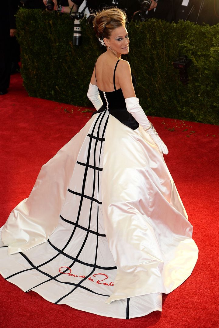 会場ではあらゆる角度から撮影されるため、360度どこから見ても写真映えすることが重要。この年の共同ホストも務めたサラが着用したオスカー デ ラ レンタのドレスは、まさに後ろ姿も印象的。なお、こちらの黒の格子柄はチャールズ・ジェームスへのオマージュ。