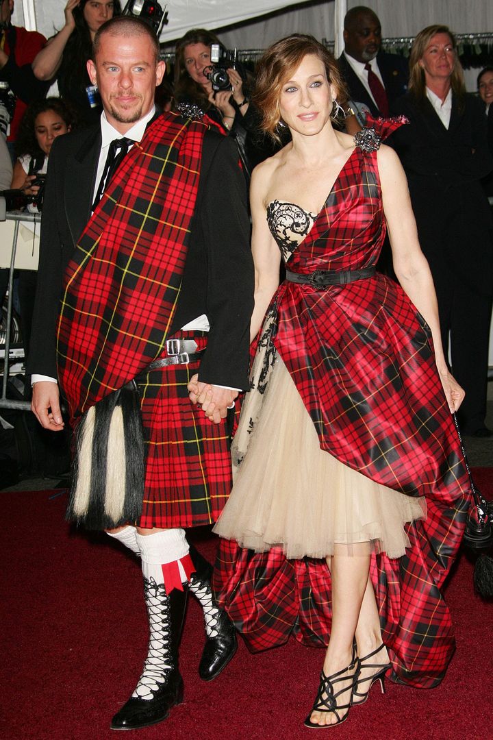 サラ・ジェシカ・パーカーは、ドレスをデザインしたアレキサンダー・マックイーンとともに、鮮やかなタータンチェックの衣装で登場。目立ち度満点のリンクコーデが、ひときわ存在感を放っていた。