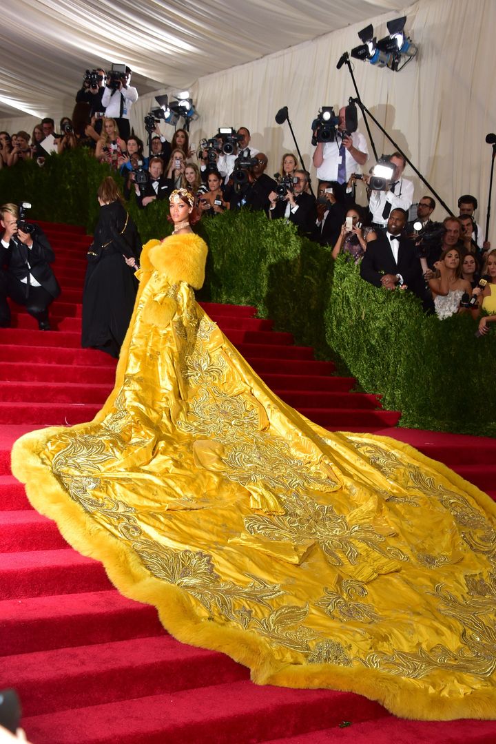 毎年期待を超える圧巻のルックを披露してきたリアーナ。レッドカーペットの歴史に残るこのイエローのケープドレスは、4.8メートルにもおよぶトレーンの長さが話題となり、SNSでも大きな盛り上がりを見せた。こちらは中国人デザイナーのグオ・ペイによるもので、制作に2年かかったそう。