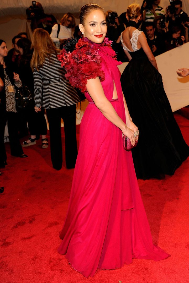 背中から袖を無数の立体的なフラワーが覆う、グッチのエレガントなドレス姿を披露したジェニファー・ロペス。