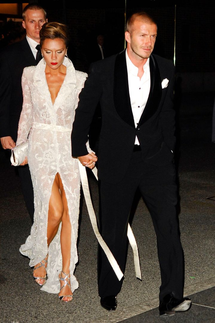 ジョルジオ アルマーニのシアーな白のドレスと、クラシカルな黒のタキシードで、グラマラスなモノクロルックを披露した、ヴィクトリア&デヴィッド・ベッカム夫妻。