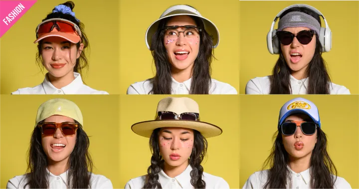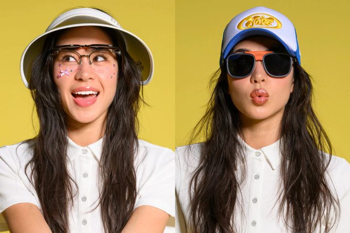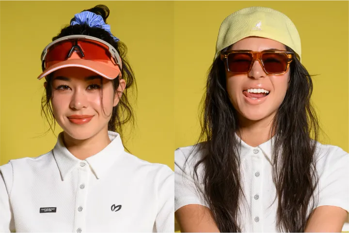 左/サンバイザー¥3,300(アディダスゴルフ/アディダスゴルフ お客様窓口) サングラス¥39,600(オークリー/ルックスオティカジャパン カスタマーサービス) シュシュ 編集部私物 右/ハンチング¥6,930(カンゴール/カンゴール ヘッドウェア) サングラス¥89,000(ディータ/オプティカルテーラー クレイドル 青山店)