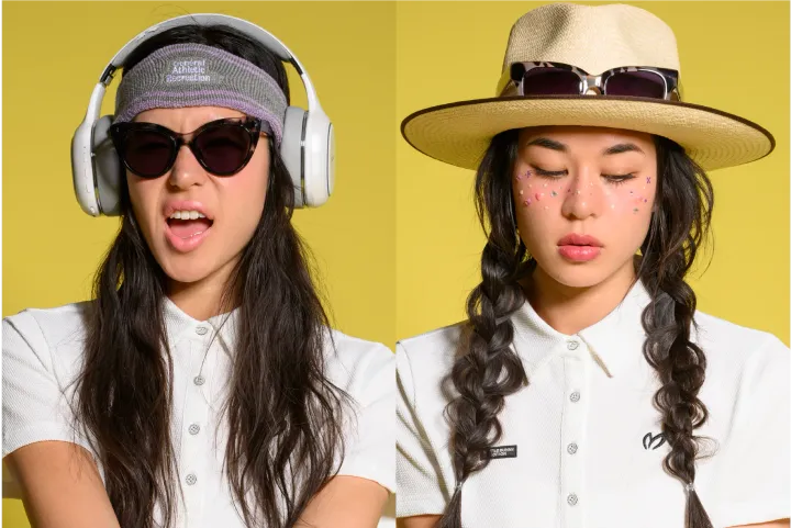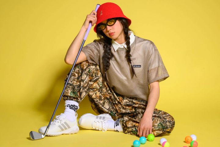 メンズっぽいカモ柄パンツとメッシュTシャツには、バケットハットと横長フレームのサングラスを合わせてとことんストリートに。一見やんちゃ“すぎ”に思えても、インに仕込んだ優等生な白ポロがコーデにきちんと感を添えてくれるから大丈夫。イエローのカラーレンズはファッションのアクセントになるだけでなく、視界を明るく保ちながらコントラストを感じやすくさせてくれるので、曇りの日のプレーにおすすめです。