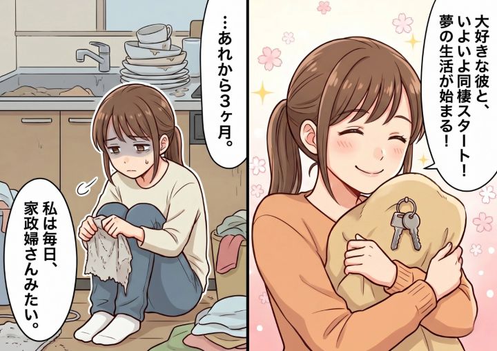 大好きな彼との同棲は、幸せなものになるはずでした。しかし、彼は次第に家事一切を私に押し付け、感謝の言葉もなくなっていきました。仕事で疲れて帰っても、山積みの洗濯物と洗い物が私を待っている日々。私は彼に嫌われたくない一心で、文句も言わずに「お母さん」のように立ち振る舞うことに必死でした。