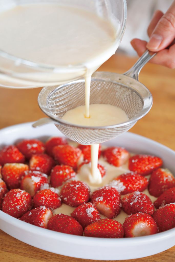 たっぷりのいちごで作る、見た目もかわいいクラフティ。材料を混ぜてオーブンで焼くだけと手軽なのに、仕上がりはプリンのようになめらかな口あたり。甘酸っぱいいちごとやさしい甘さが重なって、口に運ぶたびに幸せが広がります。