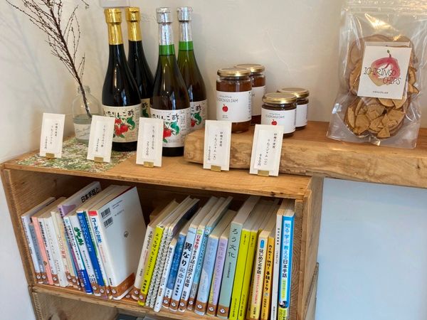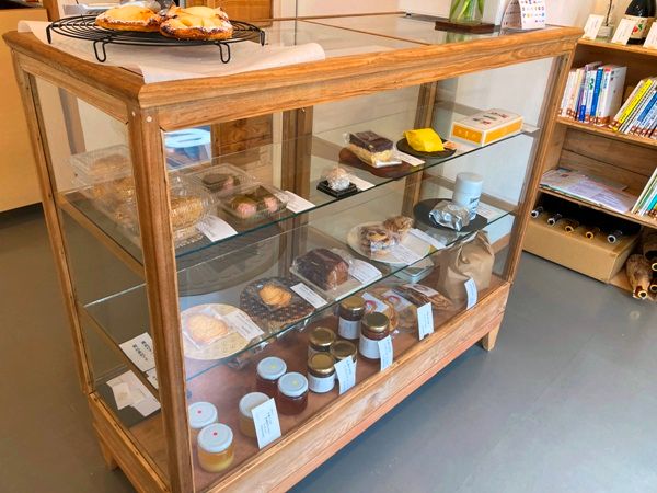 入口には毛筆で書かれたお品書きがあり、店内に入るとショーウィンドーに様々なお菓子が並んでいました。お菓子以外にもお米やジャムなどの農産品も販売しています。