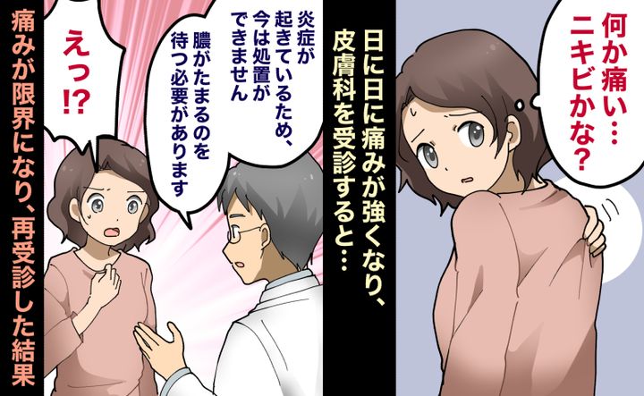 背中に軽い痛みを感じたとき、私はニキビのようなものだと思い、深く気にしていませんでした。しかし、時間がたつにつれて腫れと痛みは増強。皮膚科を受診し、思いも寄らない対応を受けることになったのです。【医師解説あり】
