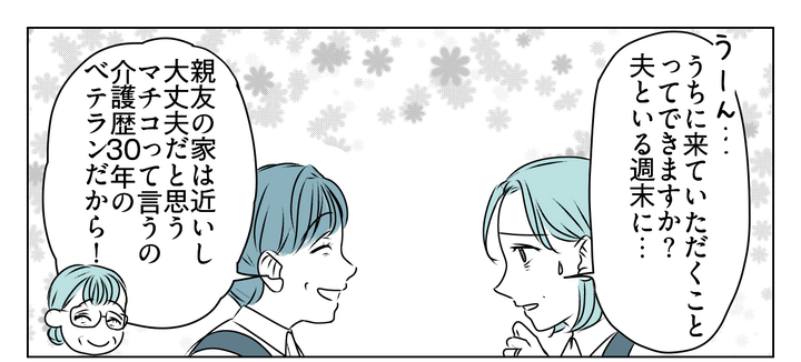 夫と話した翌日、私がまた先輩に相談すると、介護歴30年の親友マチコさんを紹介してくれることになったのです。夫がマチコさんの話を聞いて、介護の現実を知れば介護離職の意思が変わるかもしれないと淡い期待を抱いています。
