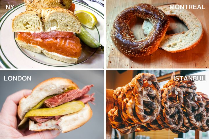 ロンドン…伝統的な東欧スタイルを色濃く残す。密度のある生地のベーグルに、塩漬けの牛肉(ソルトビーフ)とピクルスを挟んだものが定番で、ロンドンっ子のソウルフードとなっている。