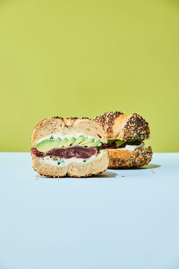 サーモンとアボカド、クリームチーズを使った NY生まれの定番ベーグルサンド、ロックスのオマージュとして誕生。主役は店の沿線にある三崎漁港で水揚げされた新鮮なまぐろ。その刺し身を塩、粗糖、ディル、米油で一晩マリネし、ごま、ポピーシード、ガーリック、オニオン、塩を振りかけた「エブリシング」でサンド。青ねぎを混ぜ合わせたたっぷりのクリームチーズも後引く味わい。