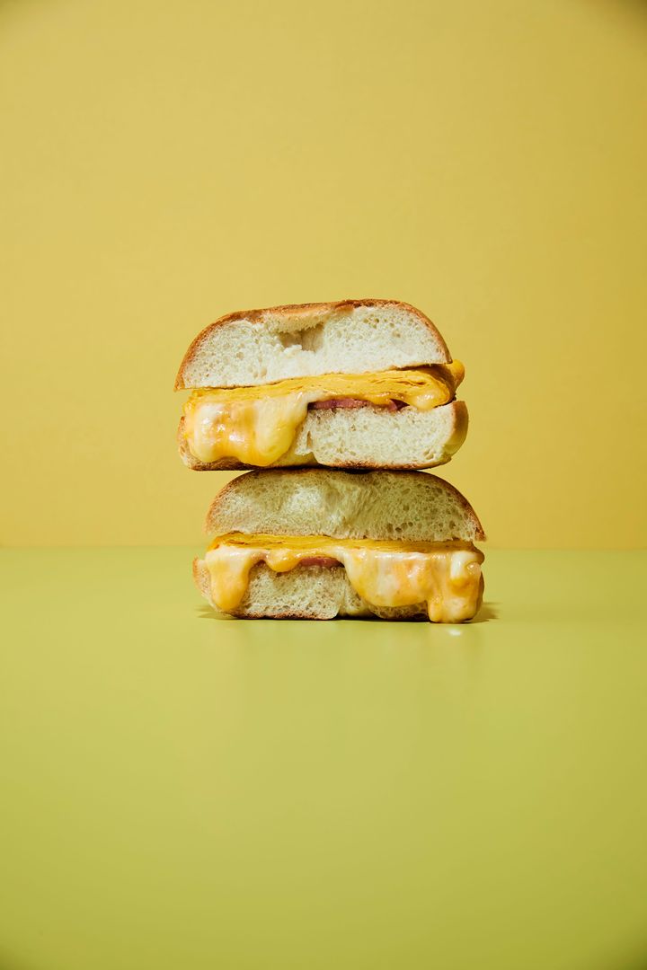各日30点限定で販売するホットベーグル。オーダーが入ってからオムレツやベーコンを焼き、5種類のチーズとサンド。半分に割ればチーズがびよーんと伸び、背徳感たっぷり。ふかっと軽い生地にマッチしている。