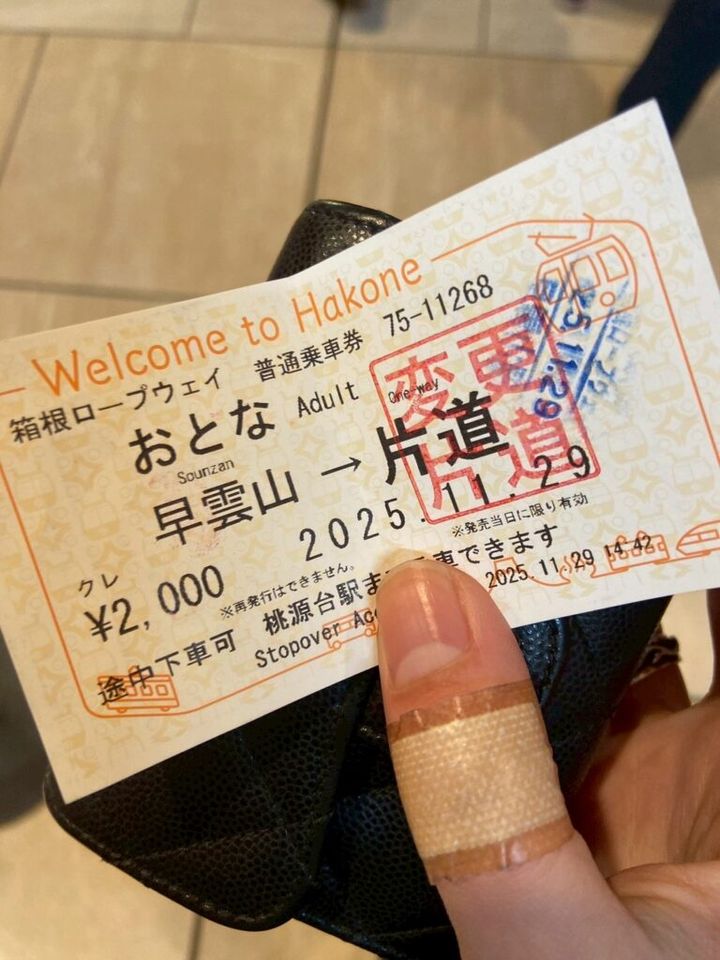⼤涌⾕からの帰り道、バスが運休していて、⾏きにも乗ったロープウェイにまた乗ることになった。⼤混雑の乗り場を横⽬にどんよりとチケットを買いに⾏くと、駅員さんが声を掛けてくれた。