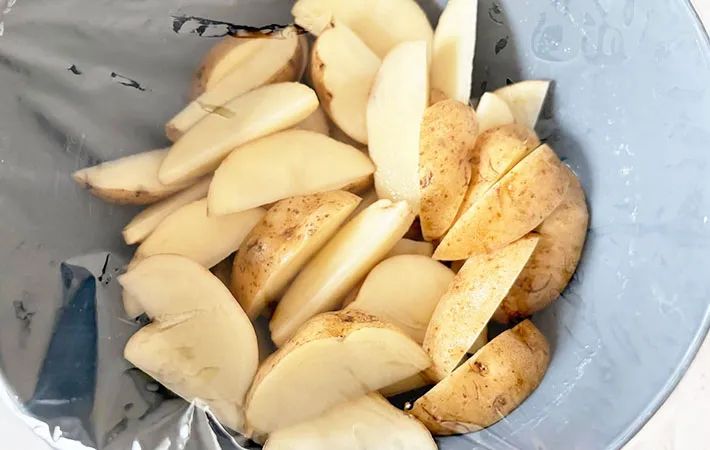 ジャガイモは、皮についている汚れをよく洗い落とし、皮つきのままくし切りにします。