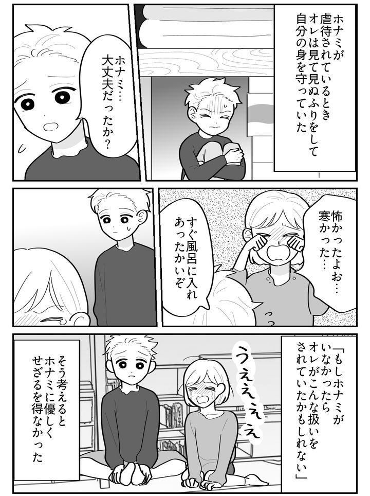 もし妹がいなかったら、オレが代わりに虐待されていたかもしれない。身代わりになってくれていることへの罪悪感と、自分も同じ目にあうかもしれないという恐怖心……。オレが妹に親身になっていたのは、決して優しかったからなんかじゃない。