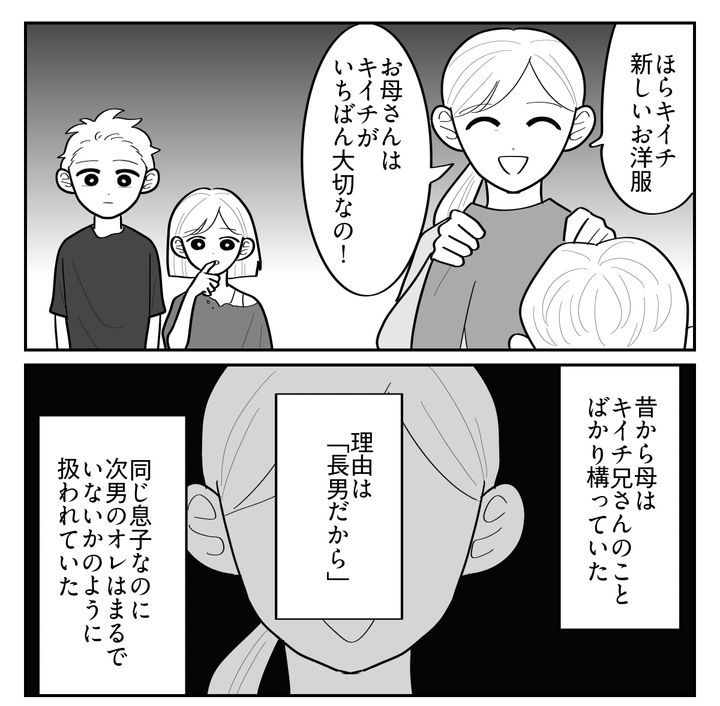オレはユウジ(30代)。現在は妻と夫婦2人暮らしをしている。母は若くして離婚し、シングルでオレたち3人きょうだいを育てていた。兄のキイチと妹のホナミがいて、真ん中のオレの存在はまるで空気。母は兄のことを溺愛し、なんでも褒めちぎっていた。一方で妹にはひどい仕打ちをしていた……。オレはそのはざまで、どう振る舞うべきか子どもながらに必死で考えていた。しかしオレが何をしても母は無関心で、相手にされることはなかった。