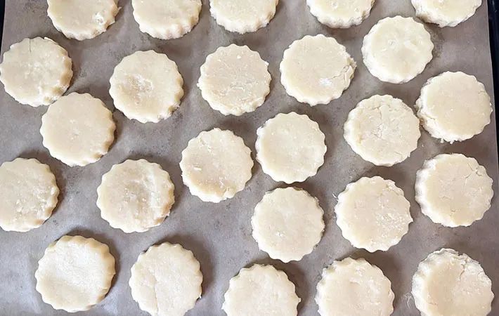 成形したら、クッキングシートを敷いたオーブントレーに並べてください。