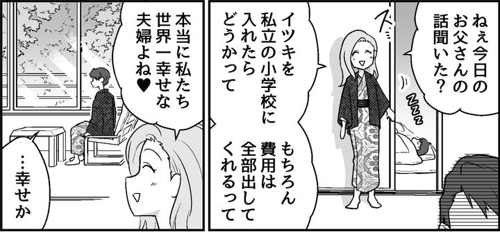 俺は会社員のトオル。妻のモモカと結婚して、3歳の息子イツキがいる。モモカの実家は裕福で、何かとわが家に援助をしてくれる。モモカは「恵まれた環境に感謝すべき」と言う。しかし俺としては、援助を受けるたびにプライドを打ち砕かれるような気がするのだ。そして義両親との、毎年恒例の温泉旅行の日がやってきた。義父は何かにつけて、俺のことを無能扱いして憐れんでくる。それが俺には屈辱的でたまらなかった。そしてイツキが寝た後……。
