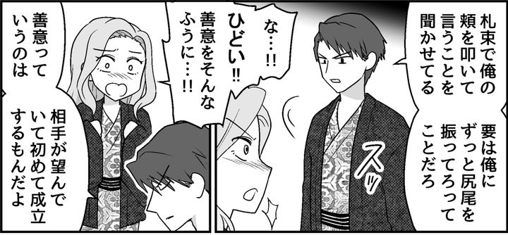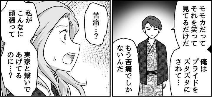 俺はその夜、モモカに向かって「終わりにする」と告げた。今回の温泉旅行で俺にははっきり分かったのだ。モモカは俺のことを対等なパートナーとして見ていない。義父に従い、お金を与えられて、ぺこぺこと頭を下げるのが当然だと思っているんだろう。義実家から無能な男と見下され、こんな屈辱的な思いをし続けるのはもう嫌だ。俺は俺自身の足で自分の人生を歩んでいきたい。