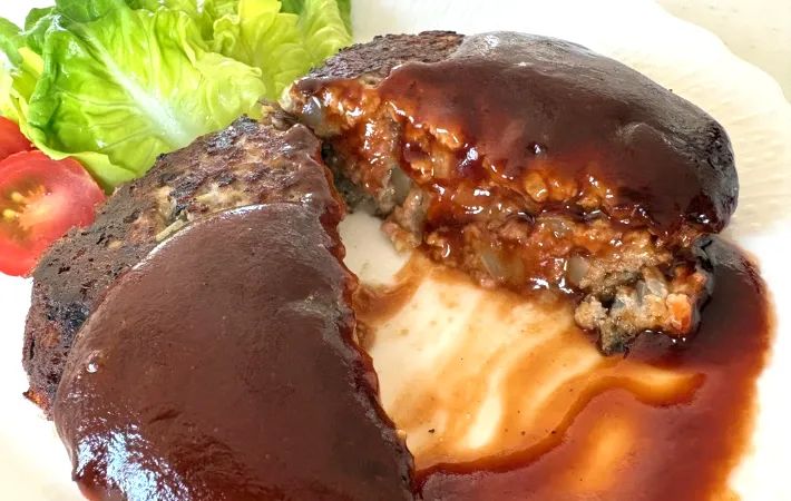 ソースがふつふつしてきたら火を止め、ハンバーグにかけて完成です。