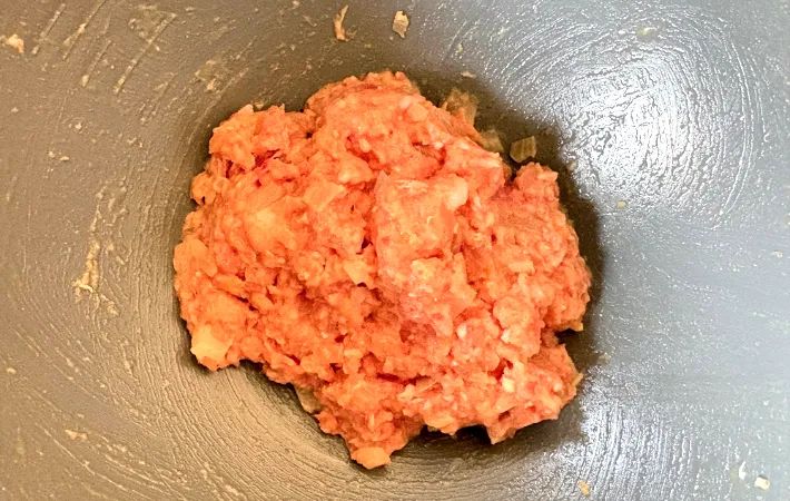 ボウルにタマネギ、牛脂、ひき肉、卵、パン粉、ナツメグを入れてこねます。