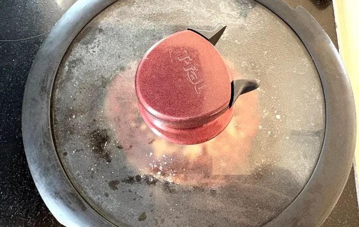 焼き色がついたら、蓋をして中火で蒸し焼きにします。