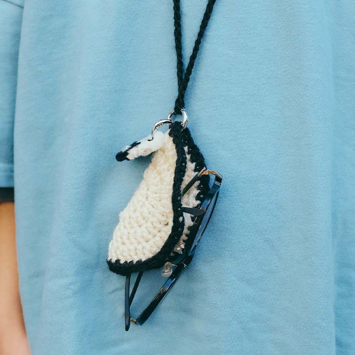ハンドメイドのかぎ編みメガネホルダーがユニーク! ブルーのトップスに映え、おしゃれ心を添えるディテールに。