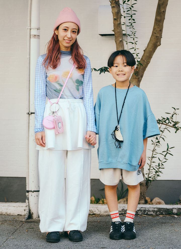 ピンクとブルーの春カラーをリンクさせたハッピームード全開の親子コーデは、ママの甘辛MIXスタイルがポイント。色違いの『アディダス』のスーパースターでリンクして、さらに統一感を演出したのがグッド!