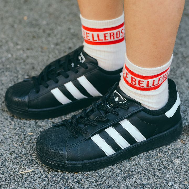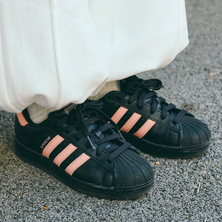 足元は『アディダス』のスーパースターを投入。ブラック×ピンクの甘辛カラーが目を引く一足。