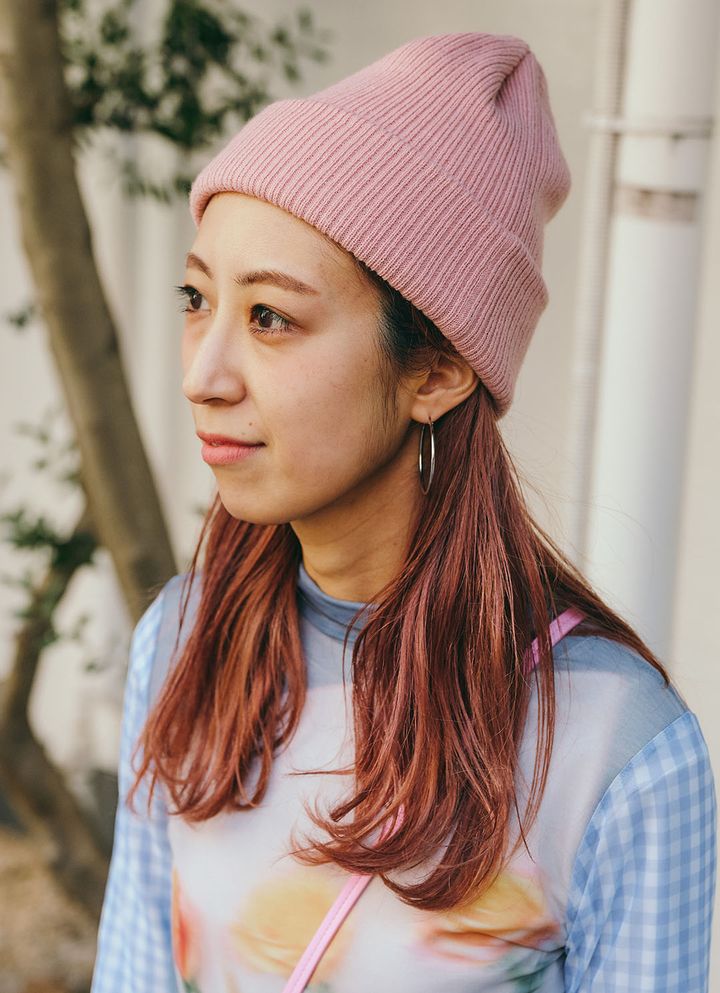 ハッピーピンクをチャージしたヘアで、春ムードを加速! フープイヤリングが顔まわりに動きをプラス。