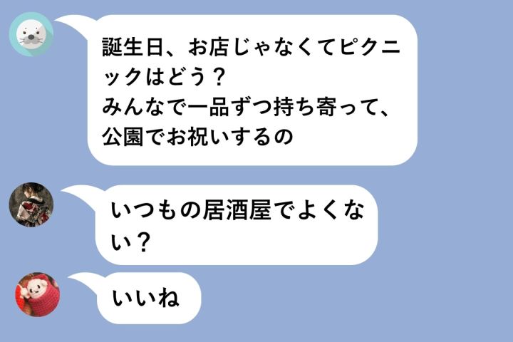 誕生日の話し合いで、彼女がメッセージを送りました。「誕生日、お店じゃなくてピクニックはどう? みんなで一品ずつ持ち寄って、公園でお祝いするの」。正直、いいアイデアだと思いました。手間はかかるけれど、彼女らしい温かい提案です。