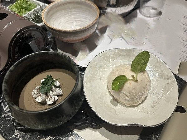 デザートでは、蟹の甲羅をミルクで煮出したアイスが提供されました。