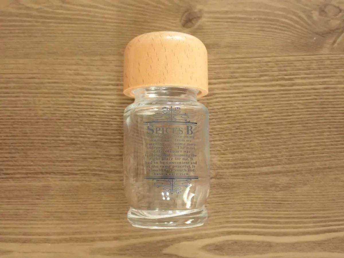 DAISO(ダイソー)の「調味料入れ(ビンタイプ) 小」は、木製のフタがおしゃれなスパイスボトルです。